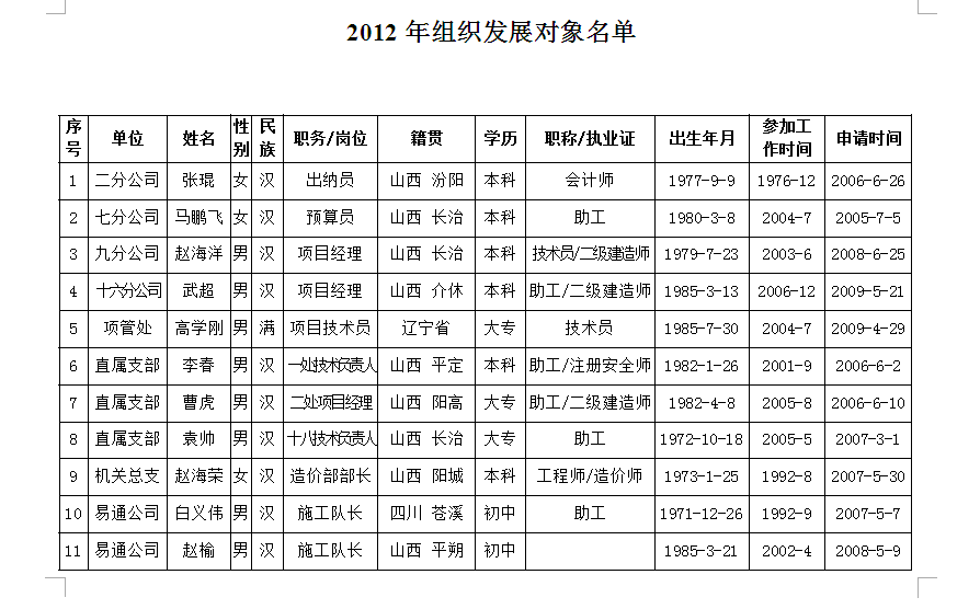 根據發展黨員“堅持標準、保證質量、改善結構、慎重發展”的工作 方針和黨委“一看信念、二看貢獻、三看口碑”的組織發展原則,經基層黨支部和公司黨群工作部兩級考察,擬吸收二分公司張琨等11名同志為中共預備黨員,并在近期提交所在支部黨員大會討論。為保證組織發展質量, 現將11名發展對象的基本情況公示如下,接受廣大黨內外群眾監督。