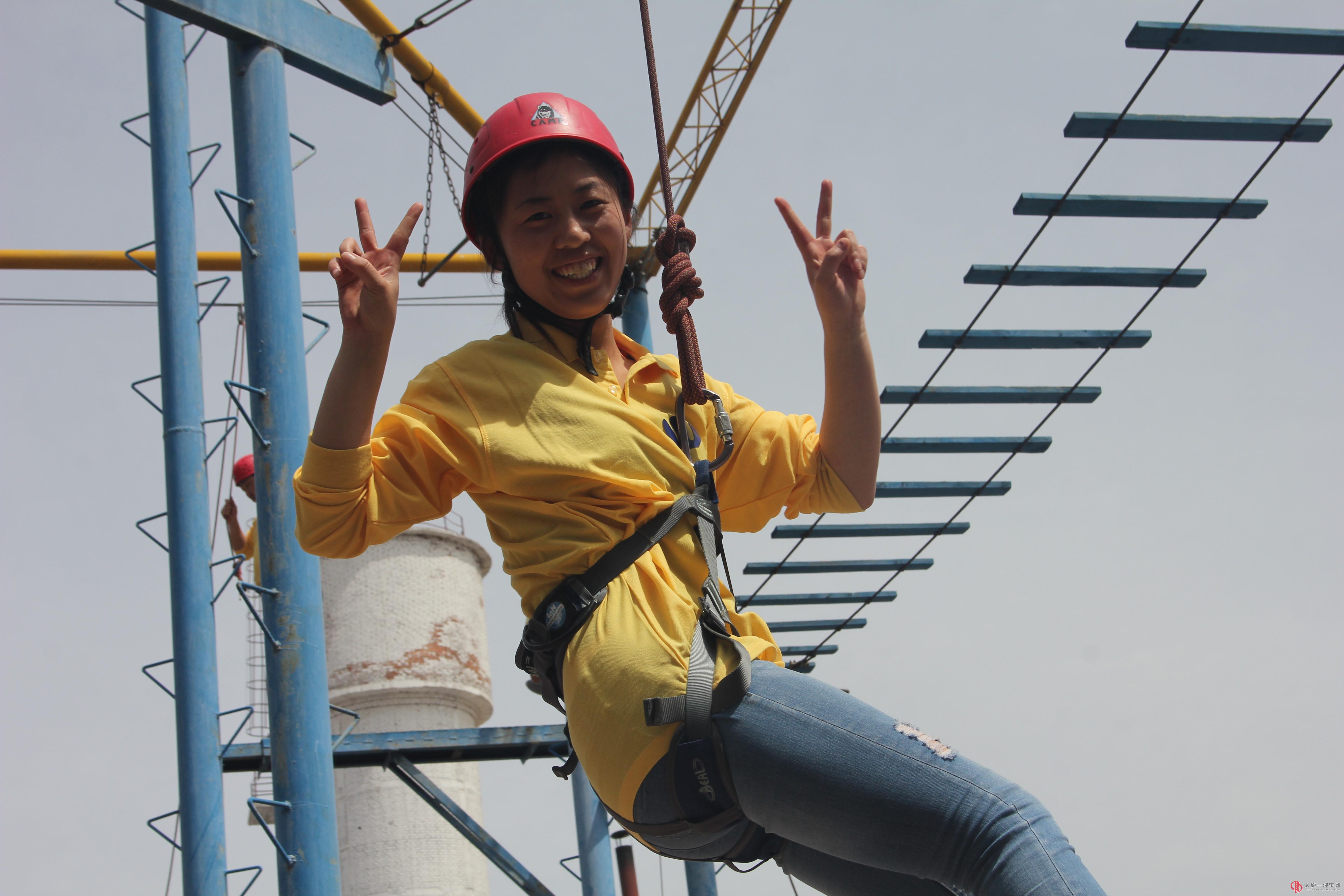 第二天我們挑戰(zhàn)了第三個新的項目也是讓我印象深刻難以忘懷的一個,“空中抓杠、高空斷橋”,在高空要做這個動作卻需要相當(dāng)?shù)挠職?,看到同事們一個個輕松的跨出高空的一小步后,我也勇敢的爬到圓盤上,在這時才發(fā)現(xiàn)邁出這“一小步”的艱難,站在空中, 臉色瞬間煞白,腿一直在發(fā)抖,不敢跳,怕抓不住距離1.5米的杠,心里浮現(xiàn)著出現(xiàn)失誤的景象:踩空了怎么辦,滑了怎么辦?恐懼和困難在我的想象中不斷的放大,我膽小的對著下面的隊友喊著:“我不行了,我恐高”,可是隊友給出的是讓我很意外的鼓勵,我沒有想到隊友會如親兄妹一樣鼓勵我給我信心,我能看出他們十分的擔(dān)心站在十米高的隊友的安危,但是他們給我起了個外號“小旋風(fēng)”,并且喊著口號,以此來讓我從內(nèi)心里感到放松,讓我勇敢的去挑戰(zhàn),他們眼神里透漏出有我們在,別害怕的信息,有他們的鼓勵我的腿不在顫抖,我高聲的喊了一句:隊友們,我準(zhǔn)備跳了,當(dāng)我笨拙的跳起來時,我雖然沒有抓住,但是我的心一下落地了,踏實了。所以在接下來的“高空斷橋”中我看著隊友們友情的臉龐我不再害怕,三下五除二的跨越了斷橋,順利的完成了這個項目。也許,眼前的困難并不可怕,可怕的是我們內(nèi)心的恐懼不斷的放大了困難的程度,內(nèi)心的屏障阻礙了我們解決困難的步伐和克服困難的勇氣。