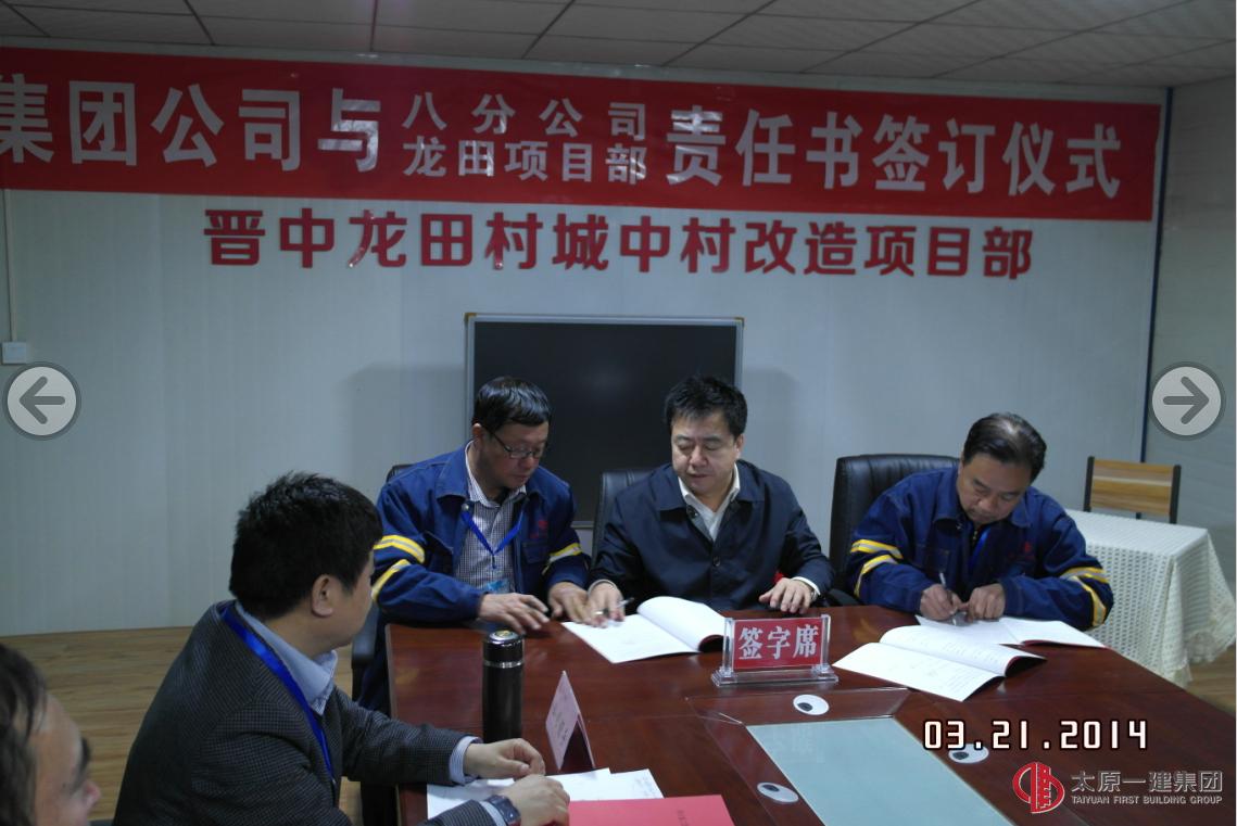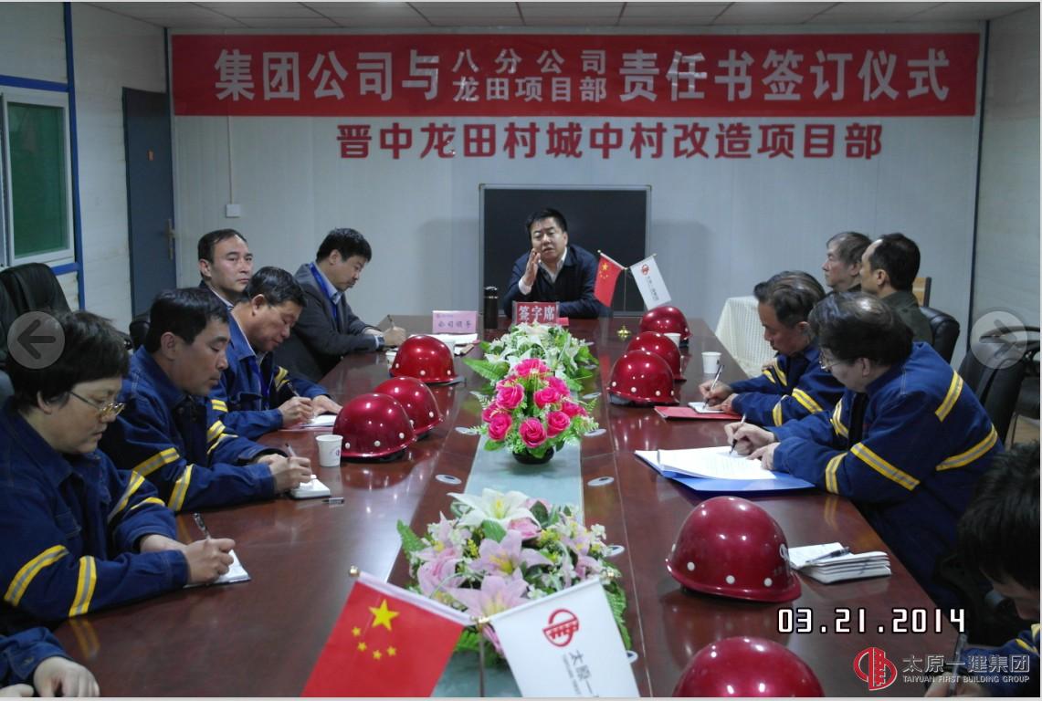 會議由集團公司副總經(jīng)理劉潔主持。首先由龍?zhí)镯椖靠傊笓]郭柱簡要匯報了項目中標后的工程進展情況,其次八分公司經(jīng)理趙晉生宣讀了“集團公司與八分公司龍?zhí)镯椖坎亢炗喌摹俄椖渴┕す芾沓邪繕素熑螘罚又杉瘓F公司董事長王貴聰、八分公司經(jīng)理趙晉生、項目總指揮郭柱、分別在“責任書”上簽字。簽字結(jié)束后,王貴聰董事長對八分公司龍?zhí)镯椖坎刻岢隽?ldquo;四點要求”,一是要求項目部做到:對甲方負責、對企業(yè)負責、對自己負責、二是要求項目部做到保安全、保質(zhì)量、保進度。三是要求項目部要樹立品牌、樹形象、樹人品。四是要求項目部要發(fā)揮好項目領(lǐng)導班子的模范帶頭作用、發(fā)揮好團隊的整體作用、發(fā)揮好太原一建集團的政治優(yōu)勢作用。