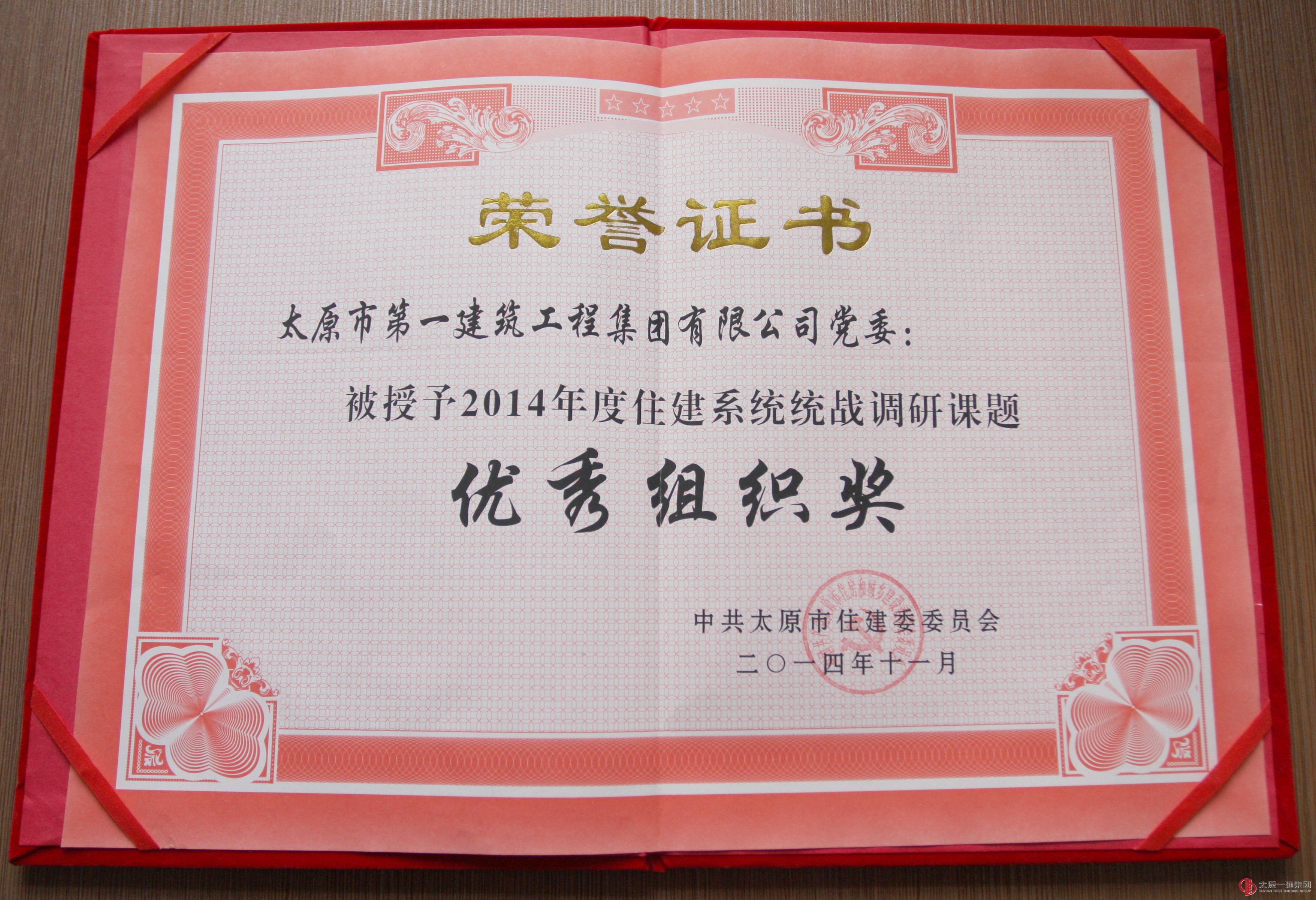 2014年,集團公司黨委參加了太原市住建委統戰部組織的“住建系統統戰調研課題”活動,因組織到位、工作出色,近日被太原市住建委黨委授予“優秀組織獎”。集團公司文化建設發展中心的王天祥撰寫的《淺談如何搞好統戰自身建設工作》一文,在本次活動中榮獲二等獎。