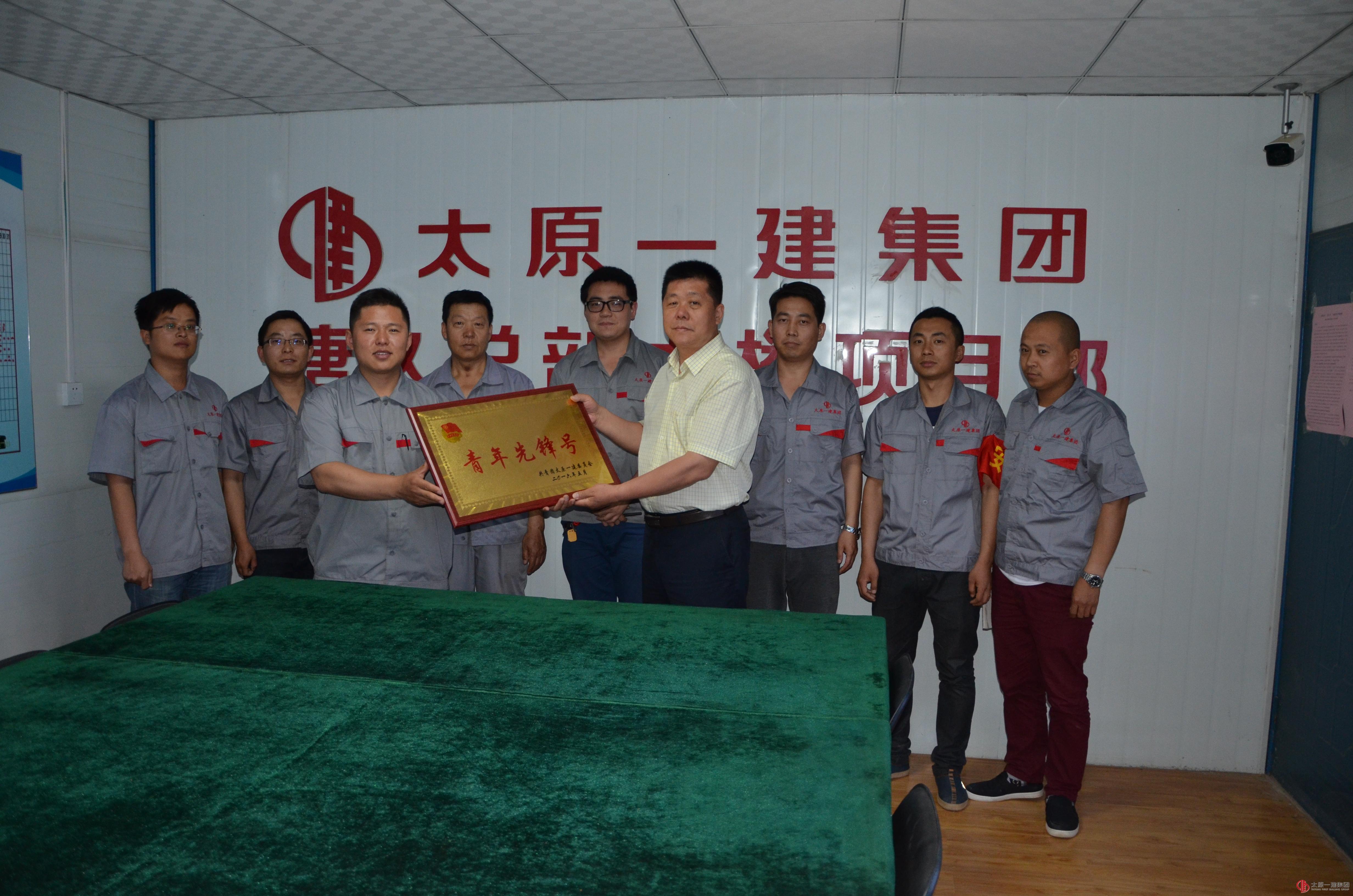 2016年6月6日下午,直屬分公司黨支部和團支部受集團公司團委的委托,由分公司黨支部書記郭貴法、團支部書記姚學斌分別為唐久總部大樓項目部、晉陽街一號地塊棚戶區項目部頒發“青年先鋒號”榮譽稱號,項目經理楊平、孟文彪及項目部全體青年員工進行接牌儀式。