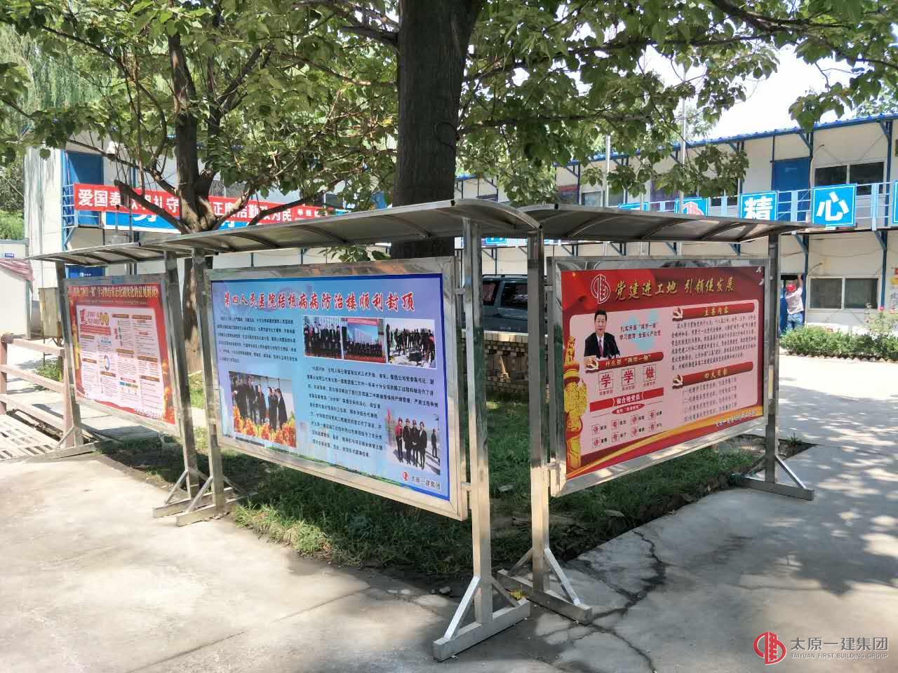 進入現場,感受著職工熱氣騰騰干勁兒的同時,還有另一番風景吸引著我們的目光。最先進入我們眼簾是從已封頂樓頂飄瀉而下的四條紅色巨幅標語,“黨建進工地,黨建促發展”;“黨建進工地 ,黨建促安全 ”;“黨建進工地,黨建促質量”;“黨建進工地,黨建促效益”40個大字標志著該項目已將黨建進工地,引領促發展工作放到了項目建設的重要位置。沿著前往辦公區的通道看兩旁,在排列有序的現場五牌二圖前五塊黨建宣傳版面更加醒目,這每一塊版面上都記載著十分公司今年支部建設的工作內容,為整個施工現場增加了濃郁的政治色彩。在支部書記辦公室墻面上懸掛著是:黨員一句話承諾墻和黨員學習園地,學習園地張貼著八名黨員的學習心得,在這間不大的辦公室里黨員讀書角也同樣為支部書記辦公室增添著生氣和亮麗。順著彩鋼板梯進入項目部會議室,會議室側面懸掛著的4塊長條型版面,將黨內“承諾、服務、廉明、監督”內容如詩如畫般展現在這有限的空間,提醒每位黨員“保持初心,擼袖苦干;為企增光,報效社會”。