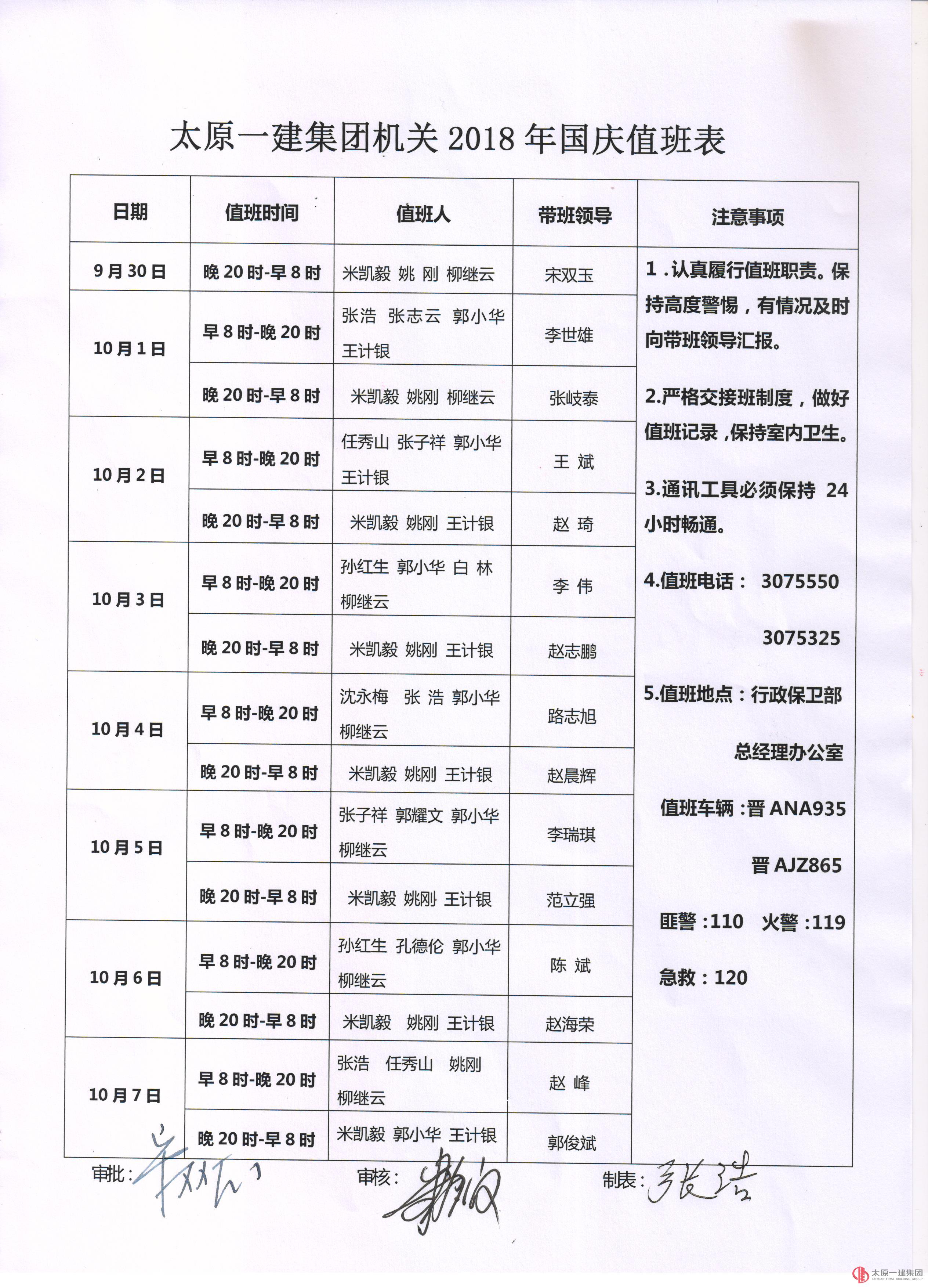 四、節日期間,各單位各部門各項目部要嚴格執行集團公司的值班值夜制度,各級帶班領導和值班值夜人員要堅守崗位,履職盡責,做好工作,如遇緊急或特殊情況,必須在第一時間報告帶班領導和集團公司值班室。集團公司值班室設在總經理辦公室(白天)和行政保衛部(晝夜),各單位的值班表務于9月30日下午6時前報集團公司行政保衛部。