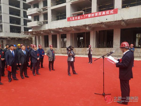 2018年10月17日上午,太原一建集團項目工程管理處承建的鄉寧縣三和晉泰房地產公司七星華庭項目舉行了隆重的主體結構封頂儀式,該項目為剪力墻結構7棟小高層住宅樓,總建筑面積為57611.9m2。項目建設單位和參建各方代表參加了本次活動。