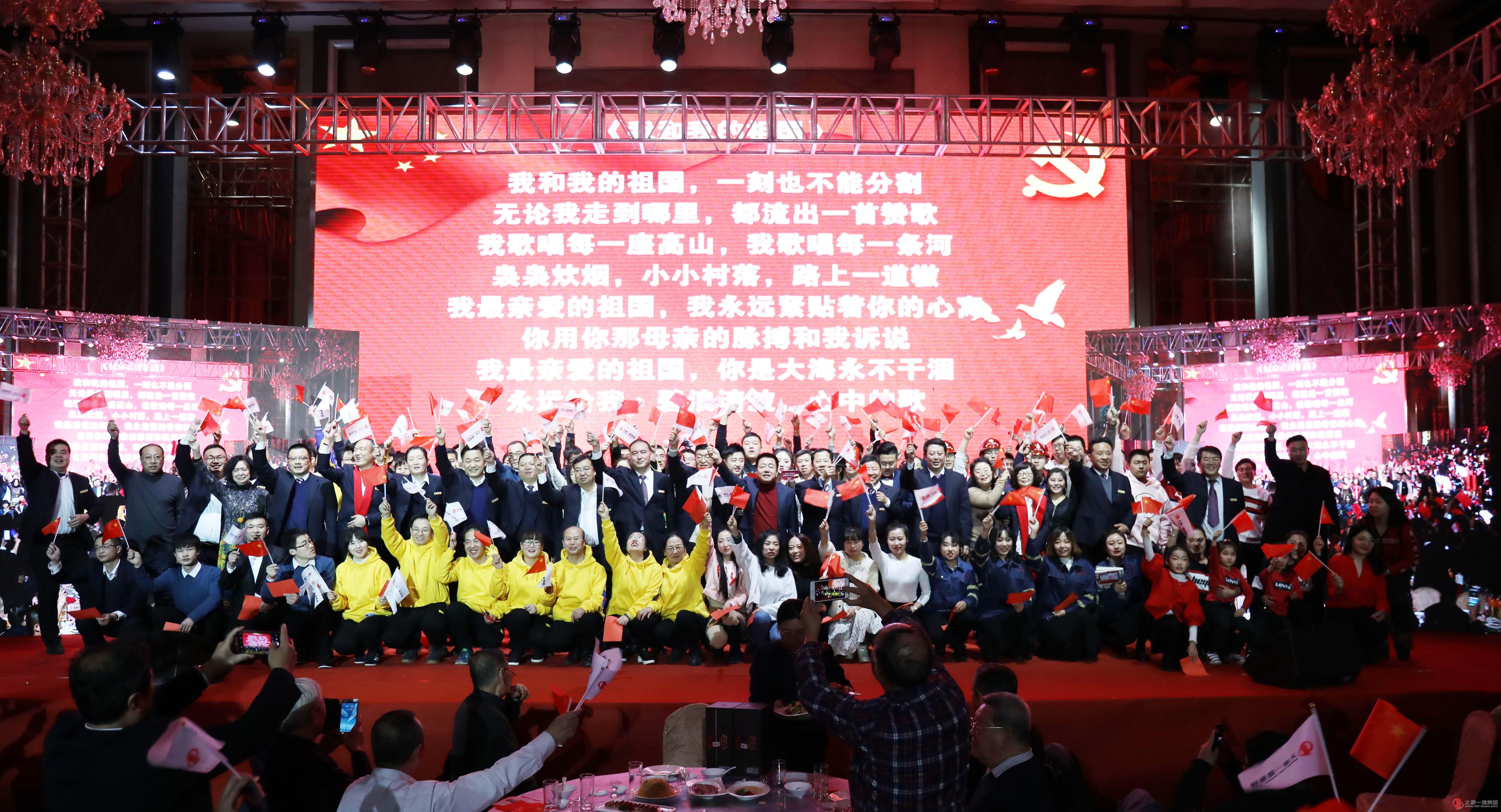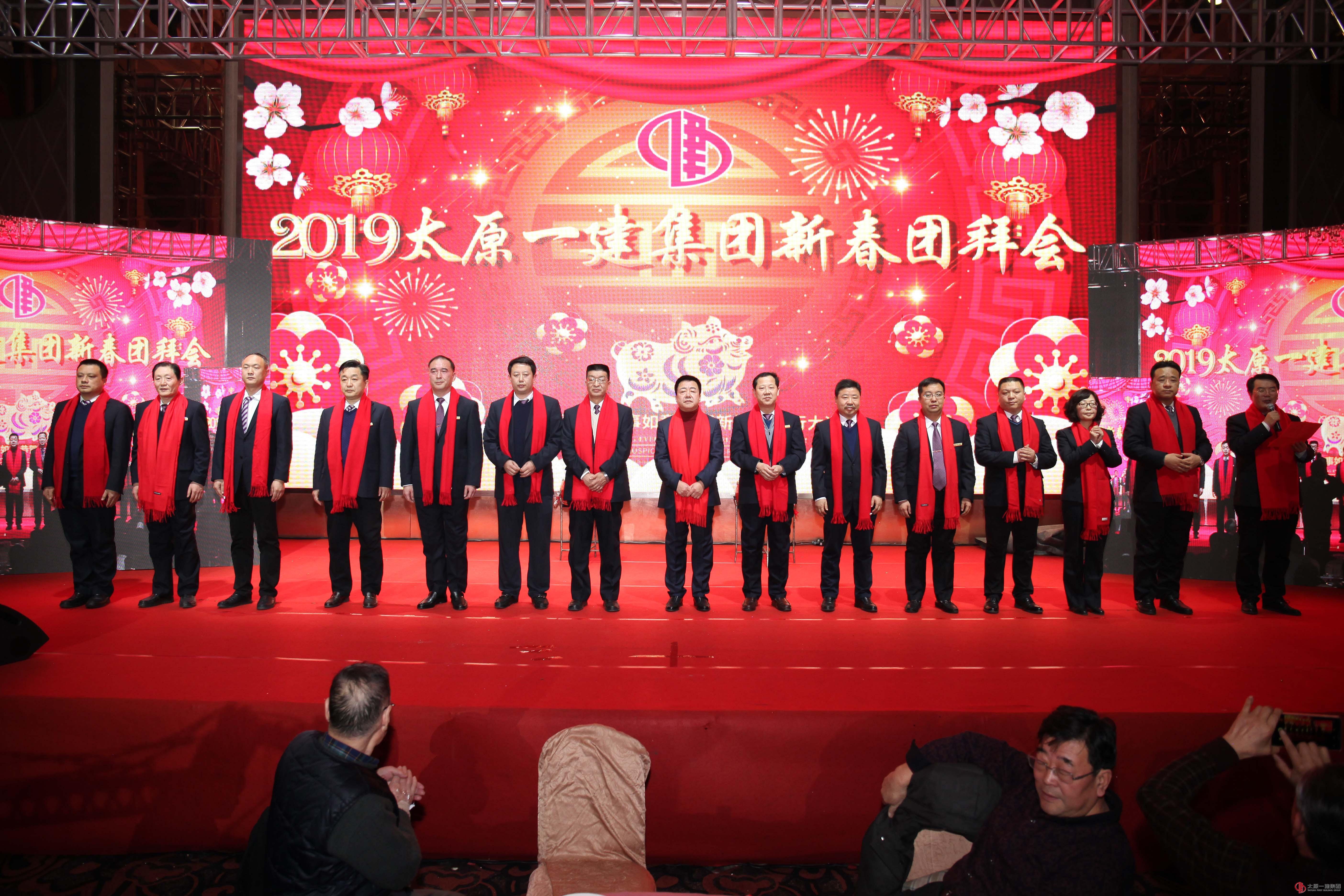 在回顧九年發展歷程視頻短片中,團拜會正式開始。黨委副書記、總經理李世雄首先致2019年春節團拜詞。黨委書記、董事長王貴聰攜新一屆集團公司高層15名領導,身披紅圍巾,集體登臺,以鞠躬形式向離退休老同志、全體員工和家屬拜年,送上的美好的新春祝福。