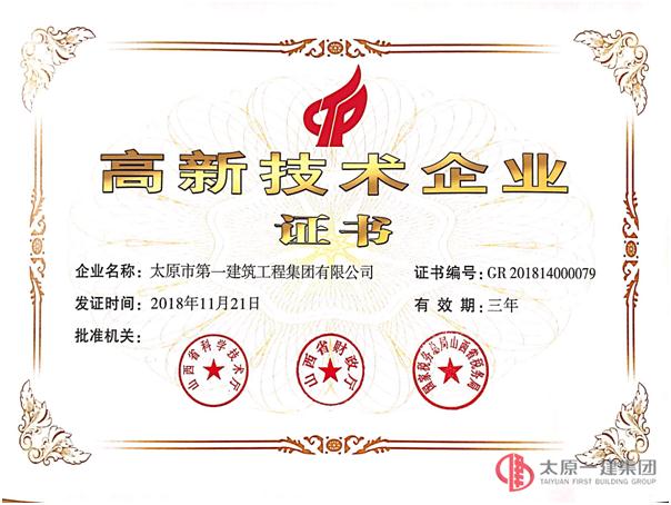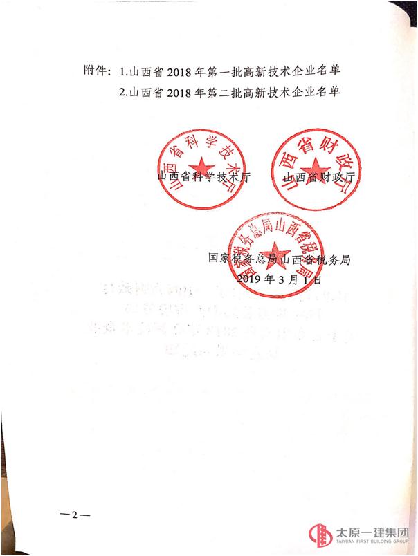 近日,山西省科學技術廳、山西省財政廳、國家稅務總局山西省稅務局聯合發文(晉科高發【2019】19號),認定太原市第一建筑工程集團有限公司為2018年高新技術企業。