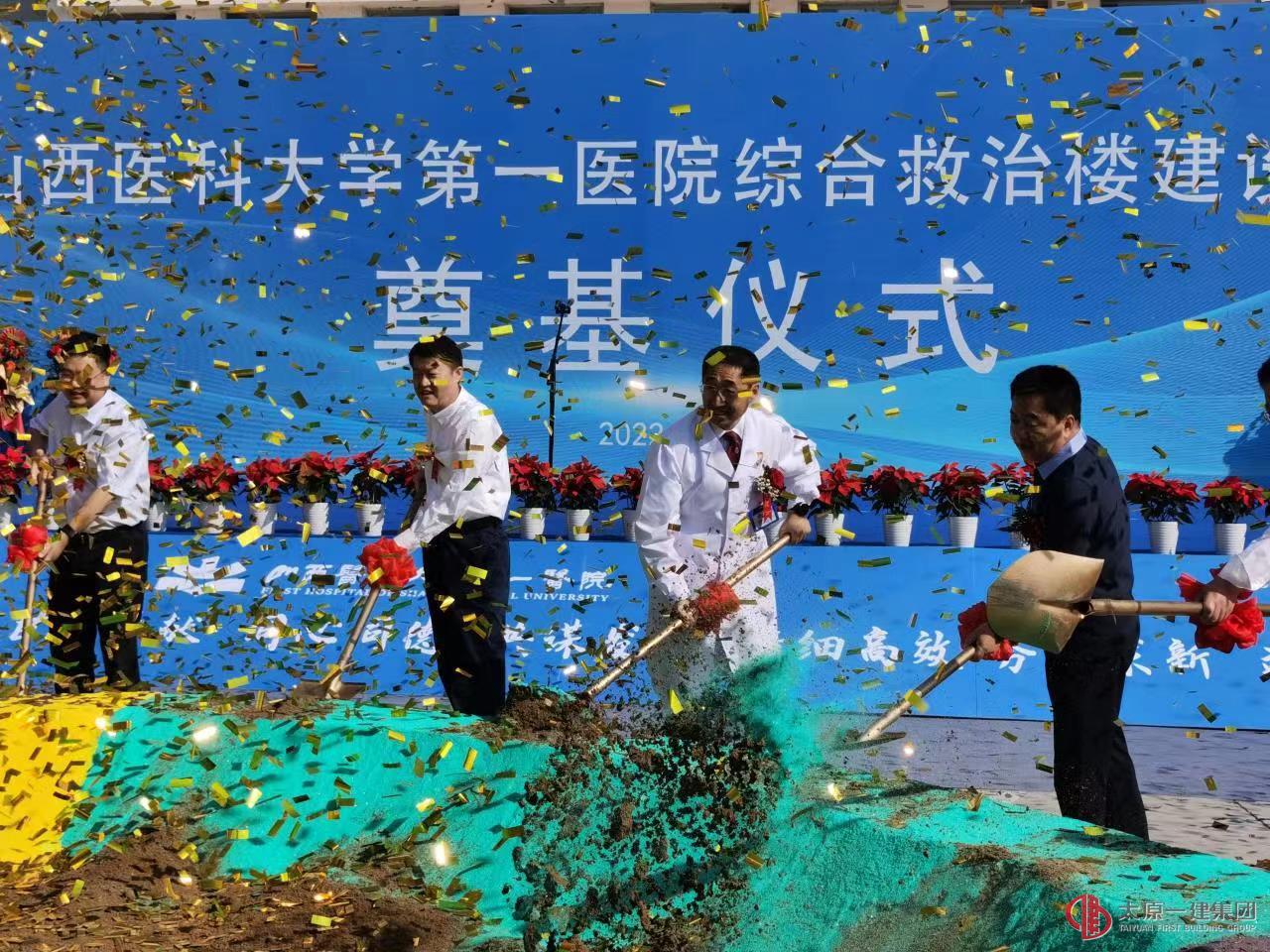 山西省衛健委副主任張波宣布山西醫科大學第一醫院綜合救治樓建設項目于2022年9月12日正式奠基開工建設!開工奠基儀式一片熱烈氛圍,各位領導同擎金鍬,揚土培基。